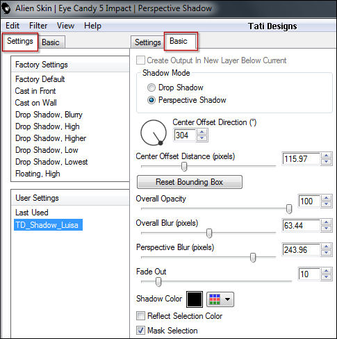 Effets / Modules externes / Eye Candy5: Impact / Perspective Shadow / Preset: "TD_Shadow_Luisa":