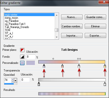 a tamaño 72, con el gradiente de antes en el segundo plano y configurado así: