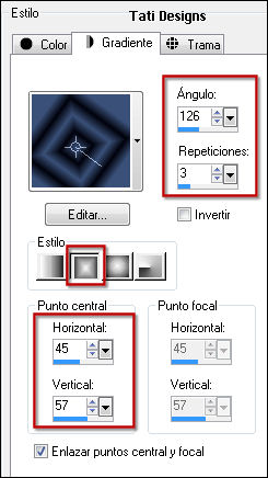 Crea un gradiente Rectangular en el primer plano con los siguientes valores:
